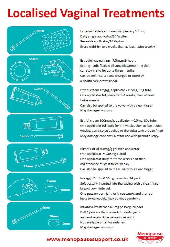 Here you can see, and read about, the products available to treat what you might hear described as the local/topical or vaginal treatment options for what doctors call the genitourinary syndrome of menopause. The poster is designed for you to familiarise yourself with the options and then download and print to take along to your GP appointment with you. Download asĀ PDF